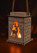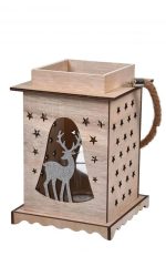Felinar decorativ de Craciun de culoarea lemnului natural si moidel stele perforate cu cerb si glitter argintiu. Cu maner – sfoara de 20cm si pahar din sticla 7x7cm pentru lumanare.